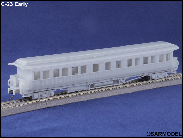 The C-23 First Class carriage, accomodating 26 passengers in six compartments and one coupe, was introduced in 1927 during the tenure of Col. Collins as CME. The layout differed from the earlier C-16 in that the two adjacent coupes were deleted and replaced with a compartment and shower. As there was no water heating, the shower was cold water only. The model is supplied in early configuration with full height toilet windows or later configuration with smaller toilet windows, the era can be selected when adding the model to your basket.